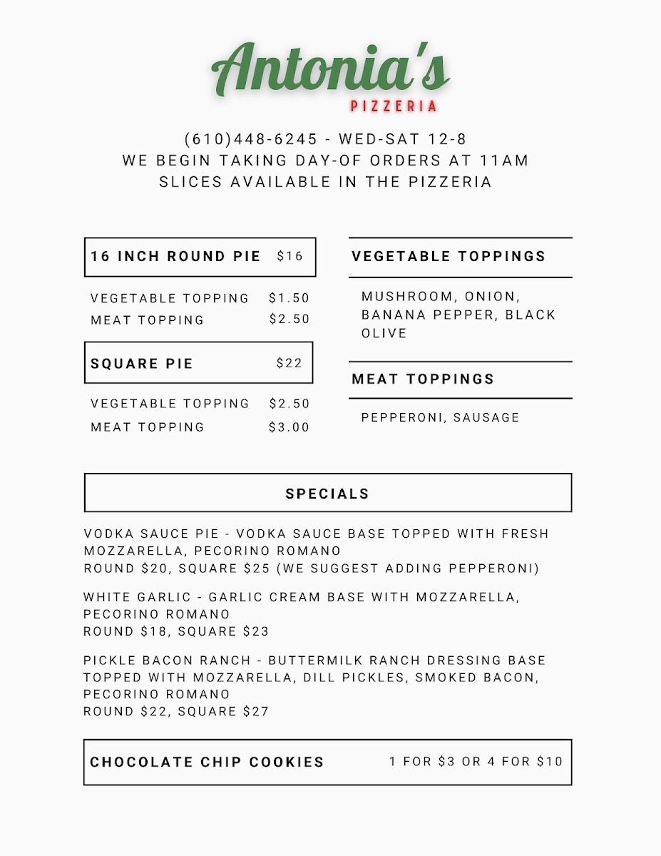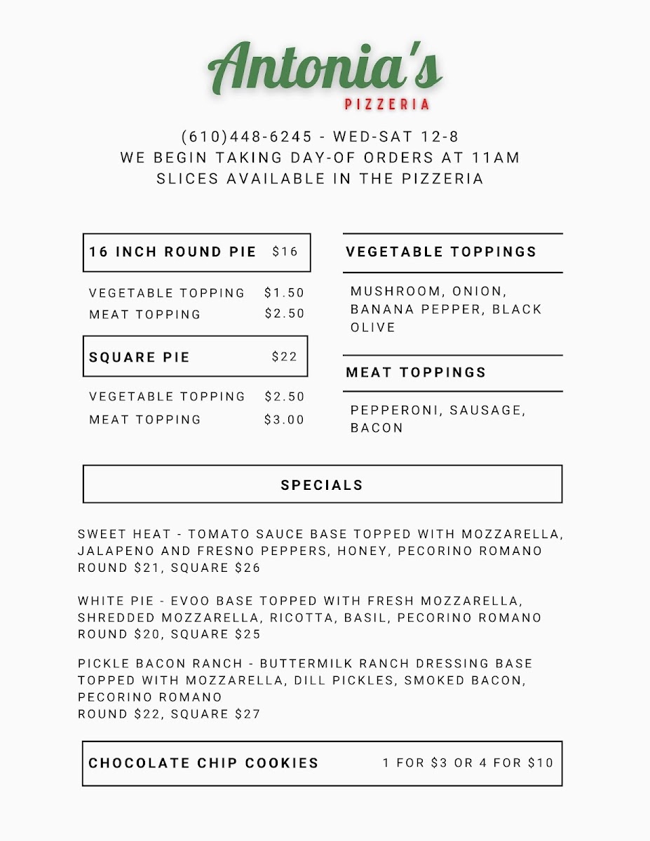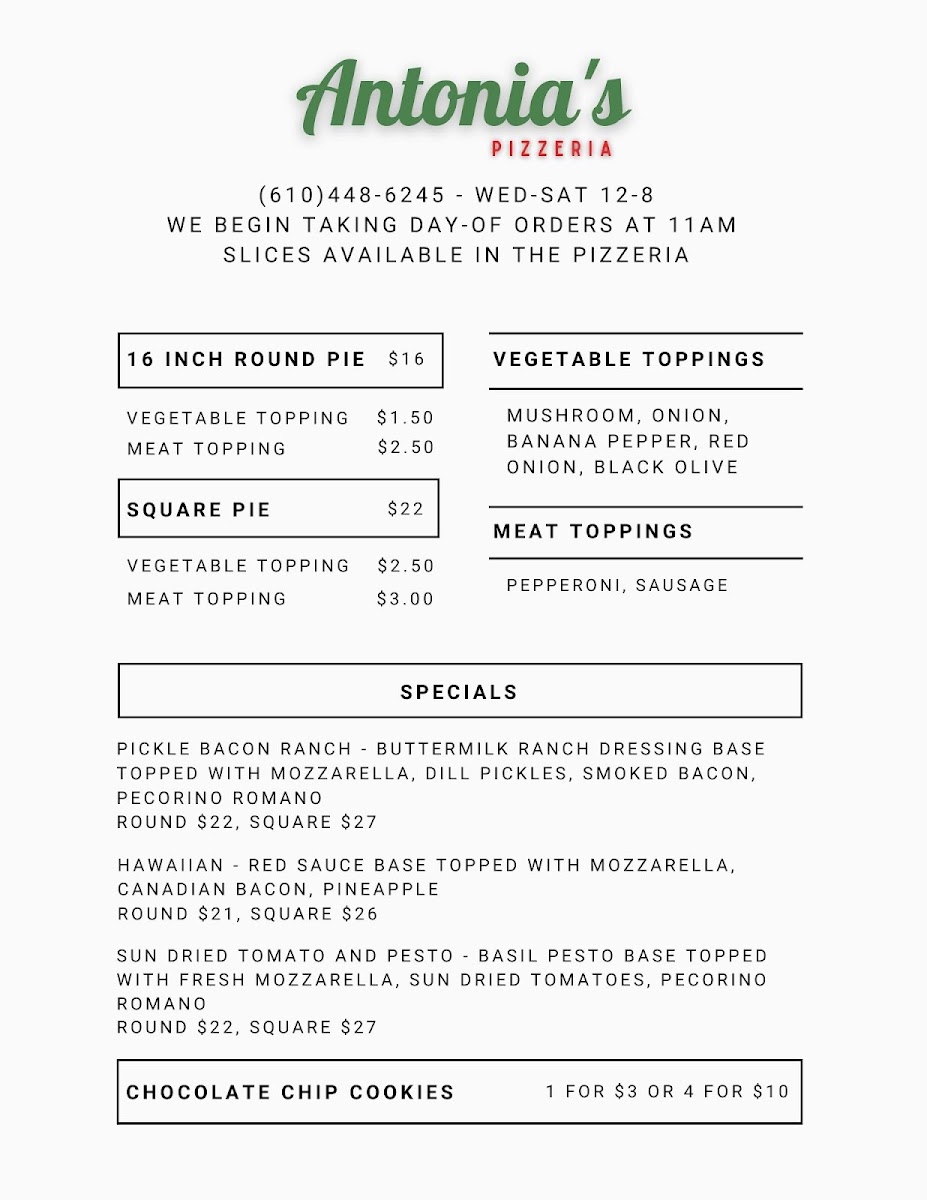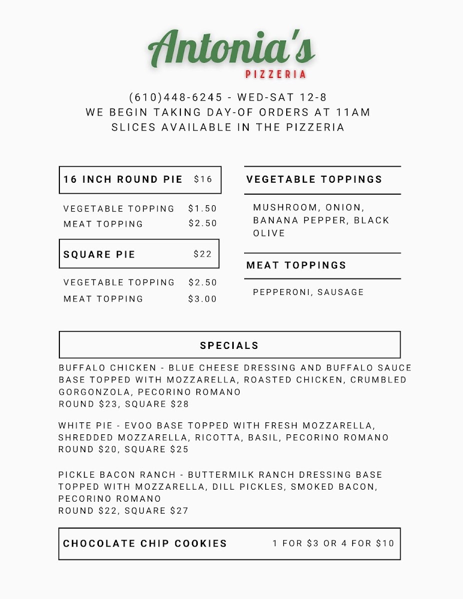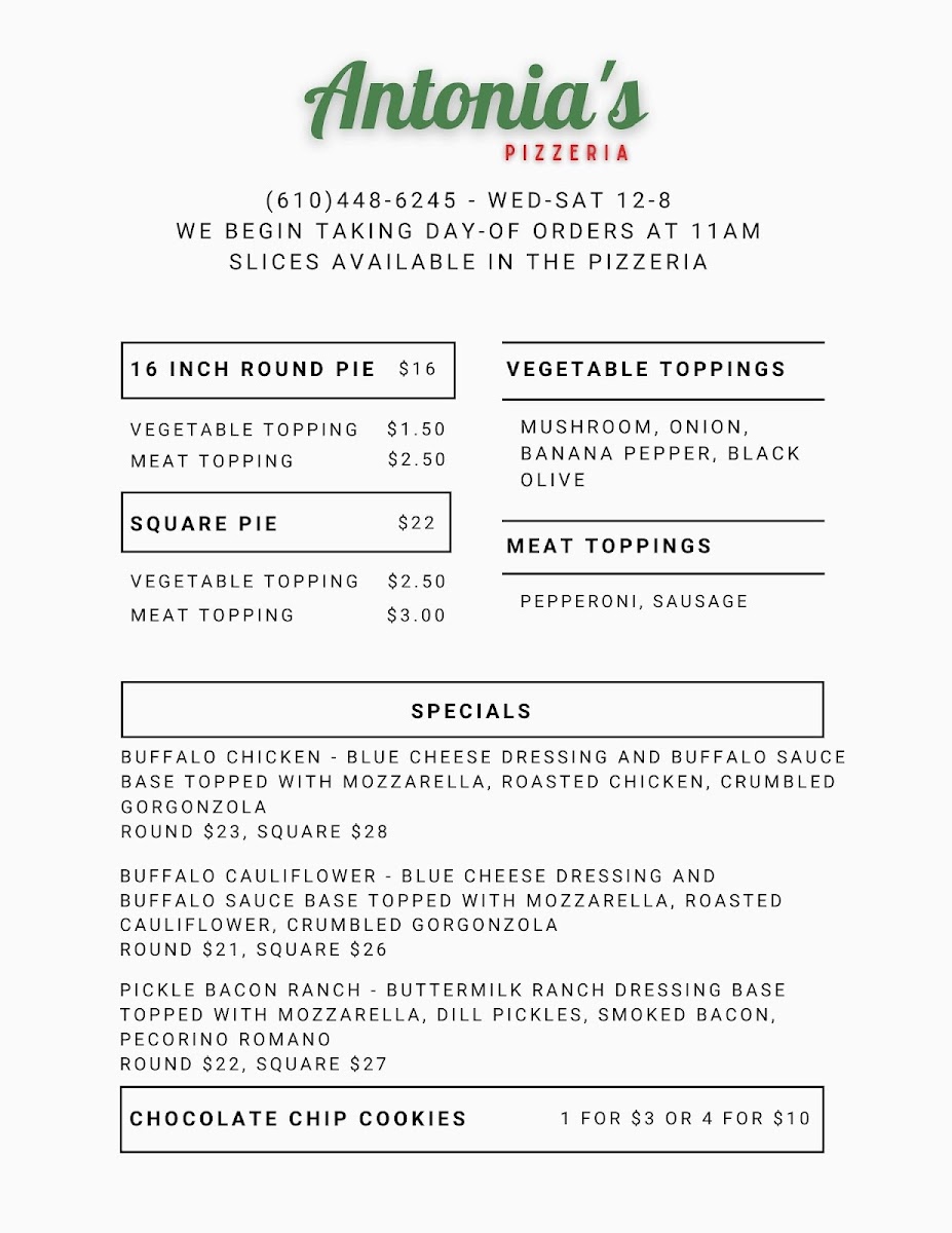From a reviewer’s perspective, the menu at Antonia’s Pizzeria offers a concise yet appealing selection that focuses on classic comfort and creative twists. The slice options like Cheese, Pepperoni, and Mushroom, along with Square Cheese and Square Pepperoni, provide reliable, straightforward choices for anyone craving traditional pizza. The specials stand out with more distinctive flavors, including Og Philly, Cowboy Candy, and Margherita, while options like Pickle Bacon Ranch and White add a playful and modern touch to the lineup. To round things out, lighter offerings such as Caprese bring a refreshing balance to the menu. Overall, even without listed prices, the variety of both classic and inventive dishes suggests a menu designed to satisfy a wide range of tastes while keeping things simple and focused.