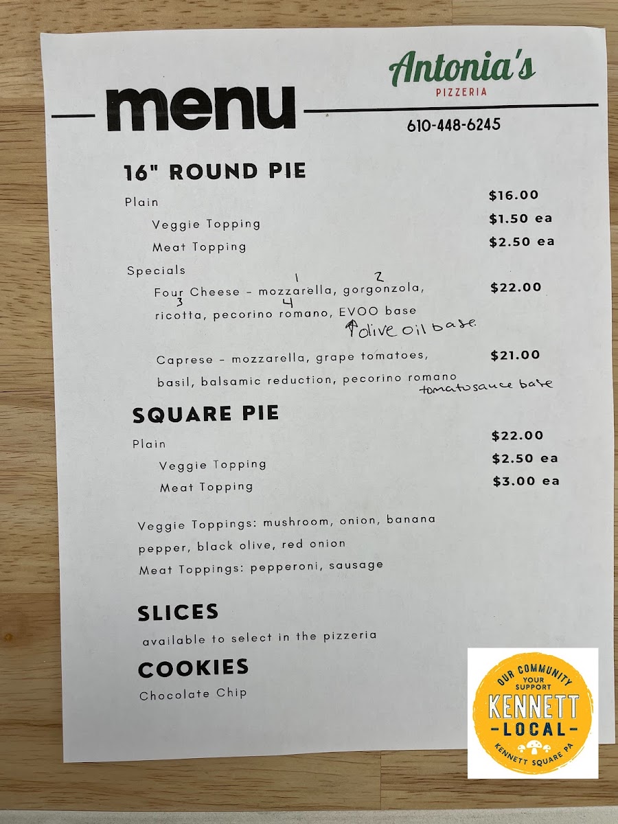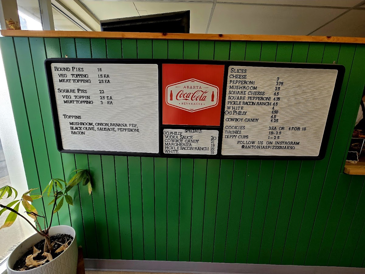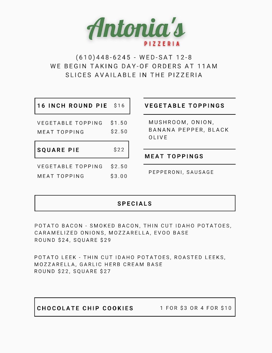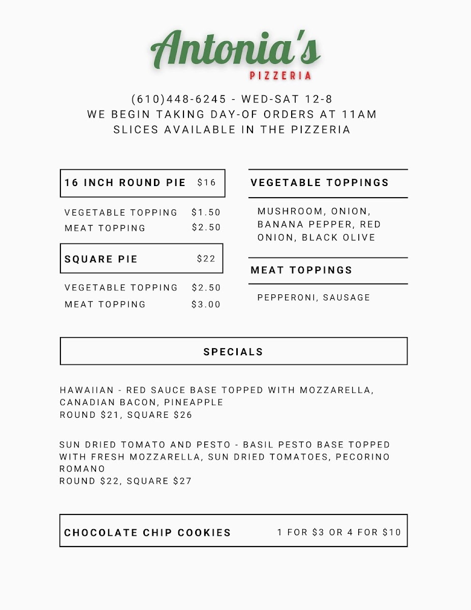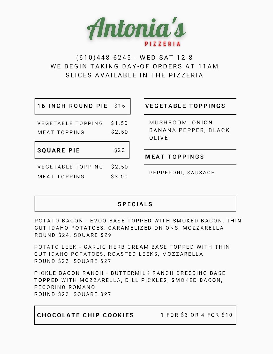 From a reviewer’s perspective, the menu at Antonia’s Pizzeria offers a concise yet appealing selection that focuses on classic comfort and creative twists. The slice options like Cheese, Pepperoni, and Mushroom, along with Square Cheese and Square Pepperoni, provide reliable, straightforward choices for anyone craving traditional pizza. The specials stand out with more distinctive flavors, including Og Philly, Cowboy Candy, and Margherita, while options like Pickle Bacon Ranch and White add a playful and modern touch to the lineup. To round things out, lighter offerings such as Caprese bring a refreshing balance to the menu. Overall, even without listed prices, the variety of both classic and inventive dishes suggests a menu designed to satisfy a wide range of tastes while keeping things simple and focused.